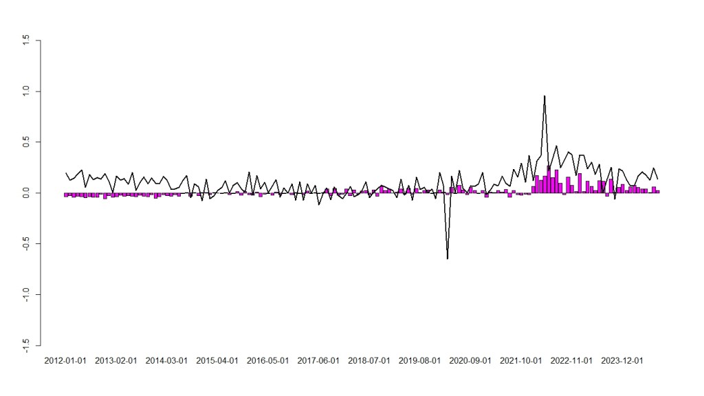 As the identified shock clearly has a clear and unambiguous effect on Finnish consumer prices, it is of interest to decompose the effect of this shock on the Core series. Below, we can see the historical decomposition of the Core from January 2020 to September 2024 using median parameter values. As we can see, from 2022 onward there has been quite significant upward pressures on Finnish consumer prices from the identified shock.