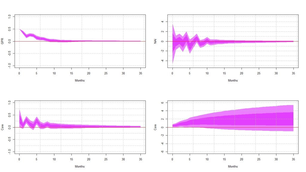 In order to have an idea on how geopolitical tensions regarding Russia propagate into the Finnish economy, let’s start by taking a look at the impulse responses of the identified shock. The shock is normalized such that it raises the Finnish GPR by 0,5 points, around which it peaked during the first couple of months of 2022. Units for the other variables are standard deviations for NAI and percentage changes for Core.